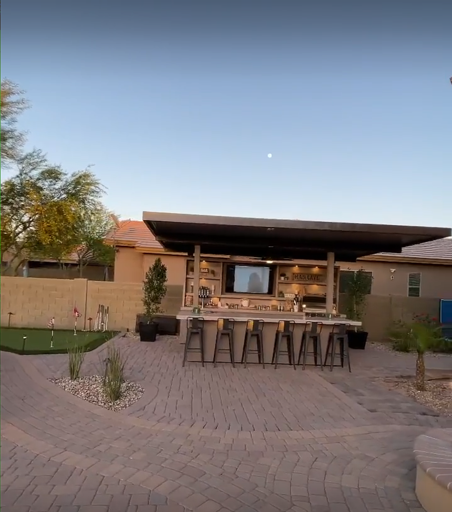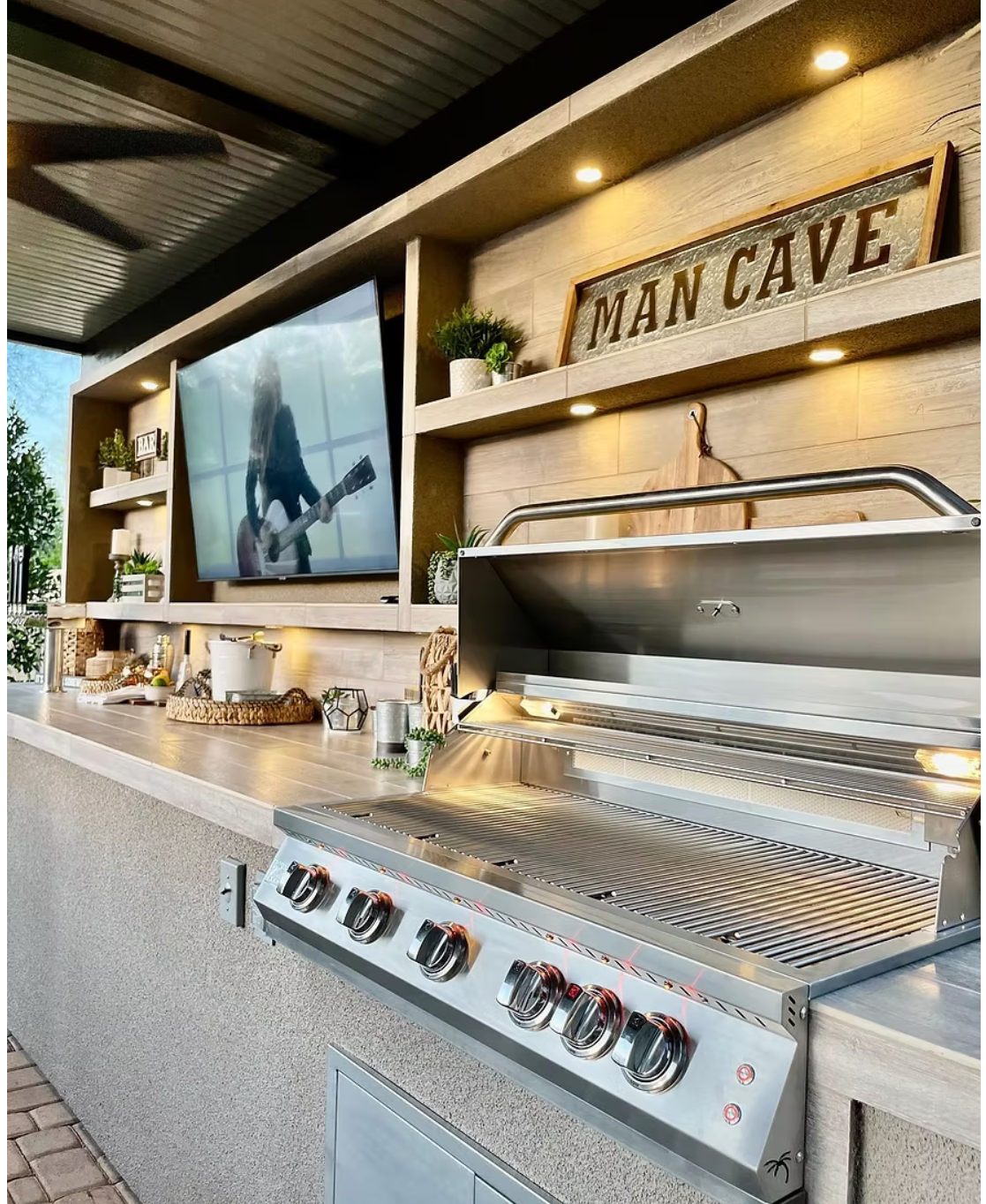 A 20'x15' aluminum roof with integrated fan provides shade and airflow, while bar and wall lighting set the mood for evening gatherings. The outdoor kegerator and enclosed shelving complete the experience, offering convenience and style in equal measure.